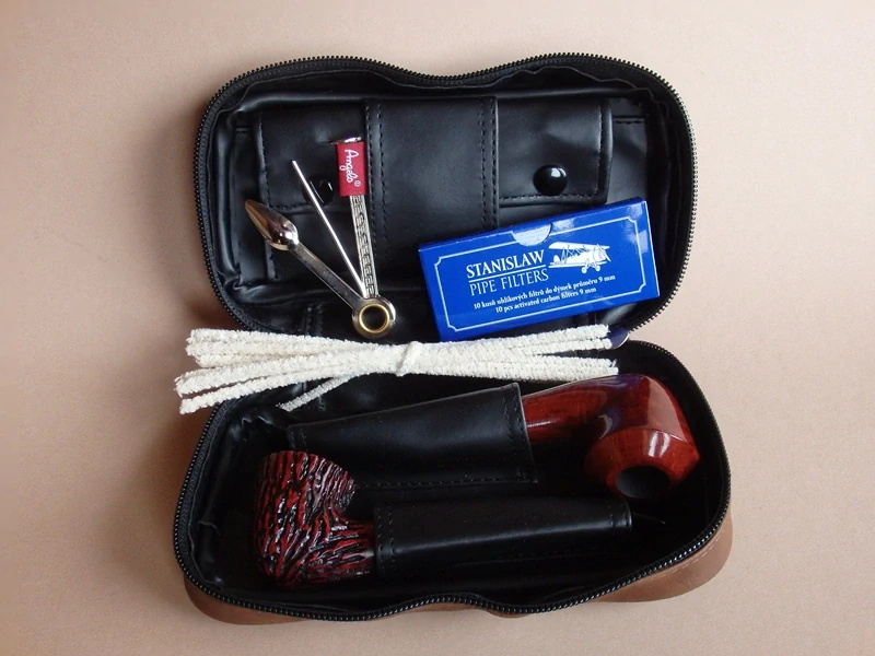 Pouzdro na dvě dýmky z umělé kůže obsahuje 2 dýmky Stanislaw, 10 čističů, dusátko, 10 filtrů Stanislaw a neprodyšné pouzdro na tabák.
