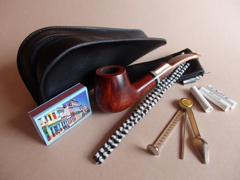 Pouzdro na dvě dýmky z umělé kůže obsahuje 2 dýmky Stanislaw, 10 čističů, dusátko, 10 filtrů Stanislaw a neprodyšné pouzdro na tabák.