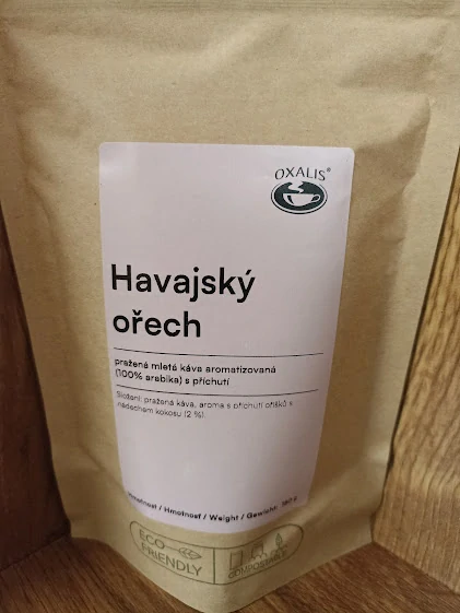 Pražená mletá káva s aroma pražených lískových oříšků s nádechem kokosu.